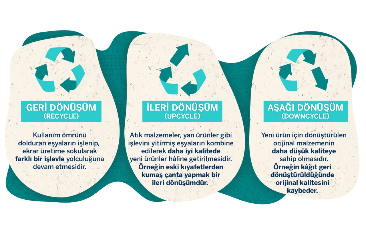 Aklınıza muhakkak ‘’peki bunun geri dönüşümden ne farkı var?’’ sorusu gelmiştir. Geri dönüşüm uygulamaları da her ne kadar doğayı korumayı ve sürdürülebilirliği sağlamayı hedeflese de unutmayalım; bu yöntemde, dönüşümün her bir aşamasında ürün yine de kalite kaybediyor ve maksimum 3. dönüşümden sonra işlevini yitiriyor.(1) İşte temel fark da tam olarak burada ortaya çıkıyor; geri dönüşümle beşiğin mezara gitmesini engelleyemiyor, sadece geciktiriyoruz. Geri dönüşümle doğaya olan zararlarımızı önemli oranda azaltabilsek de aslında kalıcı bir çözüm yaratamıyor, yolu uzatıyoruz. Üstelik bu yıkım süreci ne kadar uzarsa, doğaya verdiğimiz tahribat bir o kadar fazla oluyor; çünkü doğanın sistemi, hücresel seviyede zarar görüyor. Yani özetle, ‘Recycling’ değil ‘Downcycling’ (Aşağı Dönüşüm) yaşanıyor.