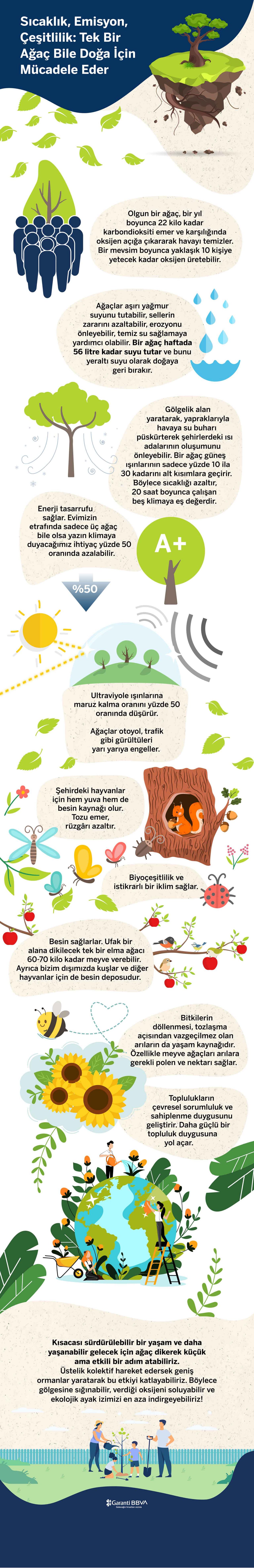 Ormanlar, gezegenimizdeki kara yüzeyinin yaklaşık yüzde 30’unu kaplıyor. İnsan kaynaklı faaliyetler sonucu açığa çıkan karbon emisyonlarının dörtte birini hapsedebiliyor. Dünya nüfusunun yarısından fazlasının yaşadığı şehirlere baktığımızda, ağaçlar buradaki sıcaklıkları 8 °C'ye kadar, emisyonları ise yüzde 40'a kadar düşürebiliyor. Daha yakın bir örnek mi istersiniz? Minyatür ağaç diyebileceğimiz tek bir bonsai bile, havada bulunan uçucu organik bileşikleri toprağa çekerek azaltıyor, böylece iç ortam havasını temizliyor. Peki ama bir ağacın sürdürülebilirlik açısından tam olarak ne kadar etkisi var?
