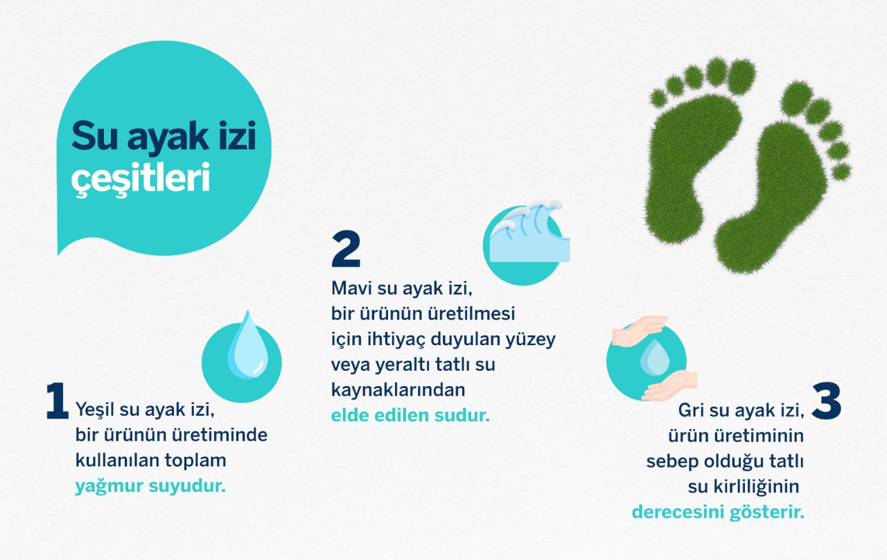 Su ayak izinin yeşil, mavi ve gri olmak üzere üç çeşidi var. Yeşil ve mavi su tüketimini, gri ise su üzerindeki kirliliği ifade eder.